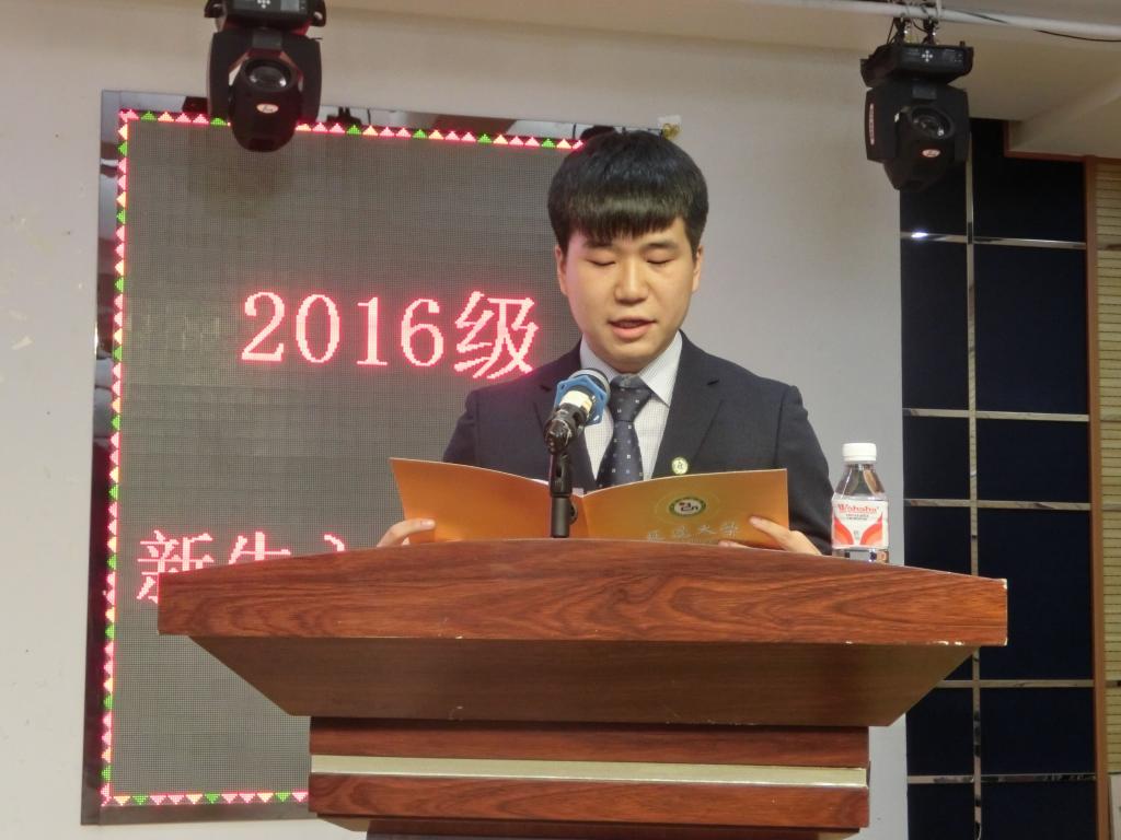 随后,2013级学生代表朴泰禹同学和2016级新生金彦宏同学代表学生发言。朴泰禹同学对新生的到来表示欢迎并分享了自己大学生活的感悟及对新生的建议。金彦宏同学分享了刚入大学的生活感悟及未来大学生活的目标。在学生代表发言后,在团委金春宪书记的带领下,2016级新生进行了新生入学宣誓仪式。最后,会议在校歌声中圆满结束。