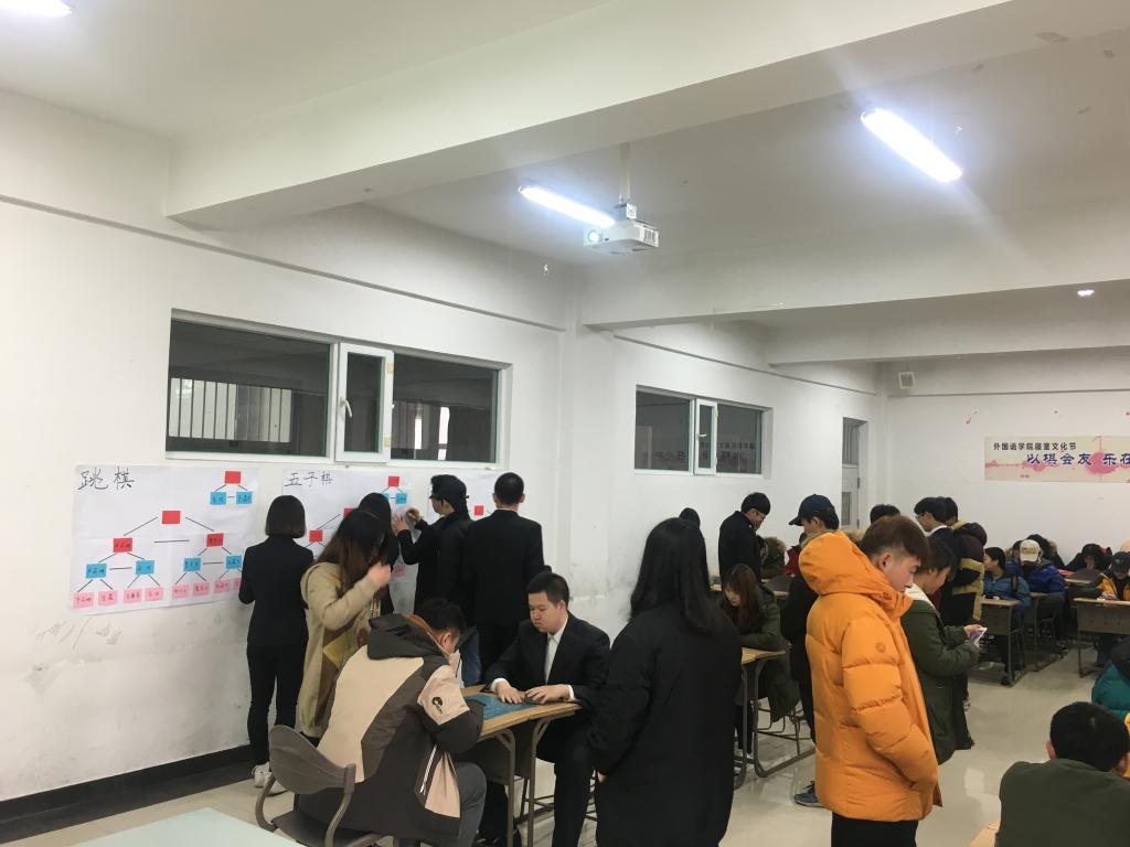 经过寝室内部,各寝室之间及预赛的层层选拔,本次决赛共有23名来自不同寝室的选手参加。经过第一轮淘汰赛,现场气氛逐渐活跃起来,五子棋,跳棋及军旗各晋级四名选手。第二轮的半决赛中选手们也都展示了自己的高超棋艺,每一步都沉着冷静地思索,现场气氛不禁更加紧张起来,经过激烈的比拼之后,共六名选手进入最后的决赛。第三轮,夺冠的最后比拼,现场气氛到了最为紧张的时刻,选手们走棋也更为慎重了。经过近一个小时的激烈角逐,终于尘埃落定,最终由2015级英语专业高航获得五子棋第一名,2016级英语专业严莉娜获得跳棋第一名,2014级俄语专业杨睿琨获得军旗第一名。活动最后郭鲜丹老师对此次比赛做了简单的总结和点评,点评后参赛选手和老师们合影留念,至此比赛圆满落下帷幕。