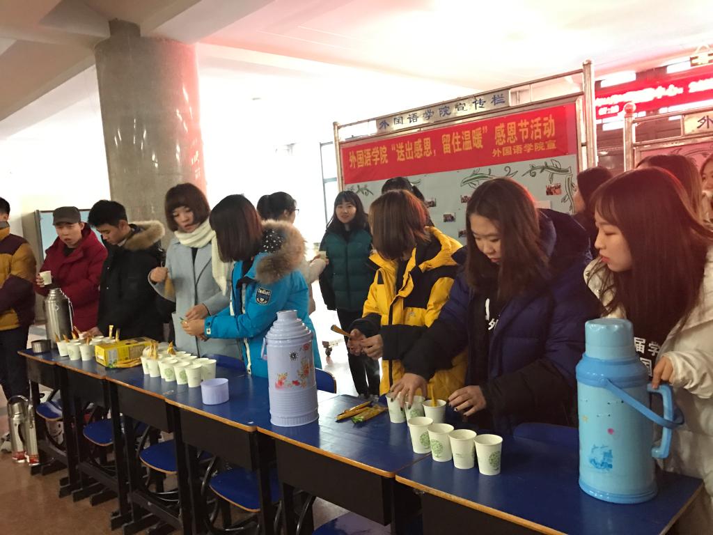 早上七点整,全体学生会成员在综合楼集合做准备工作。学生会成员们将咖啡倒入纸杯中,用热水冲好,等待着每一位到综合楼的老师和同学。每当有人到达时,学生会成员为其打开门,并送上一杯浓浓的热咖啡,道上一声感恩节快乐,并送上祝福。课间,同学们将咖啡送到老师们办公室,感谢他们的辛勤付出。中午、下午的时候也进行送咖啡活动。在综合楼一楼大厅摆放着的同学们写给老师的感谢信、同学们与老师的合影以及手写祝语展板引来了许多人的观看。