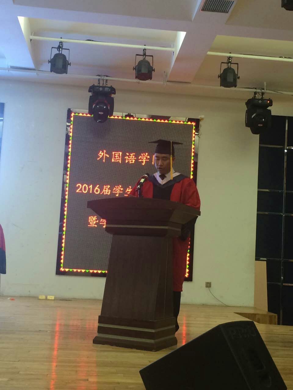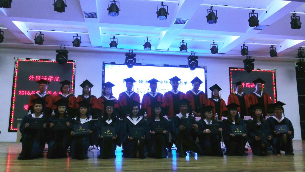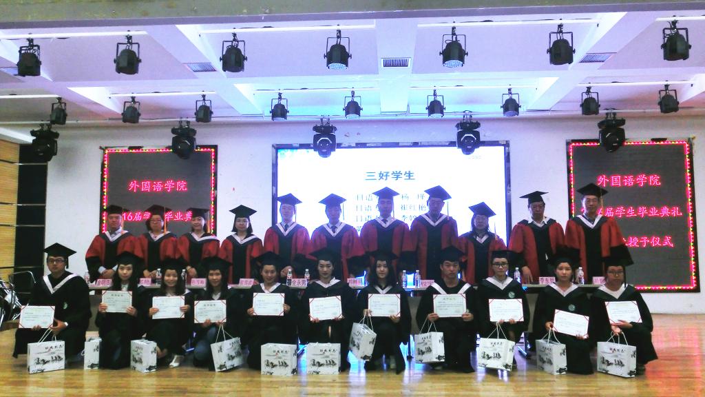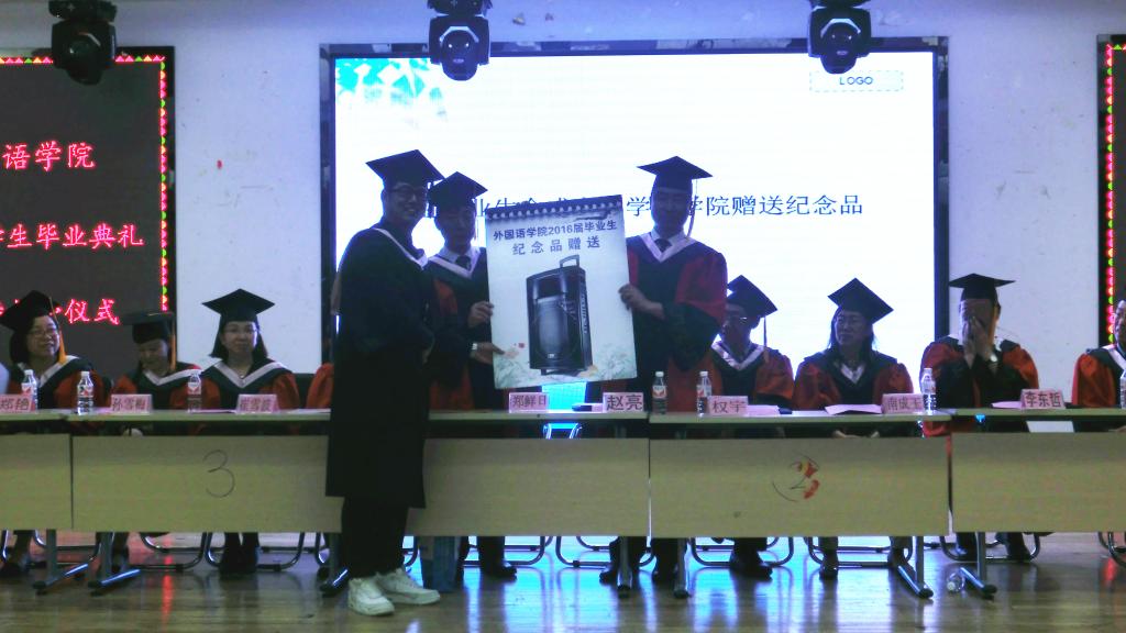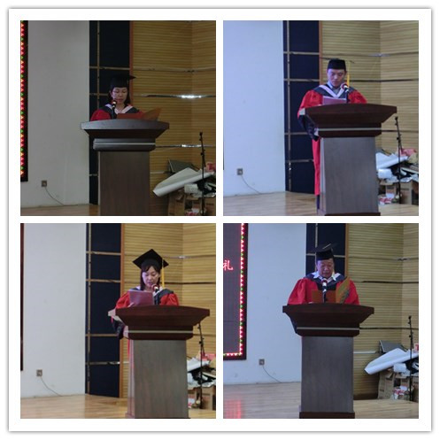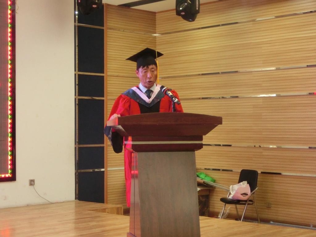 典礼伴随着庄严的国歌声拉开帷幕,播放了2016届毕业生的视频影像后,学院崔雪波副院长做了2016届毕业生的情况报告、总结了2016届毕业生在校期间的获奖情况及考取研究生情况和本科生及研究生科研项目立项、结题情况。接下来,博士生导师权宇教授宣读了博士研究生、硕士研究生毕业生名单,领导及导师代表为全体研究生授予学位证书并扶正流苏。之后,各专业主任宣读了本科毕业生名单,领导及导师代表为全体本科毕业生授予了学位证书并扶正流苏。学院党委赵亮书记宣读了本科毕业生表彰决定,领导及导师代表颁发了证书及奖品。日语语言文学学科主任李东哲教授宣读了研究生毕业生表彰决定,领导及导师代表颁发了证书及奖品。学院全永男副院长宣读了2016届年级校友联络员聘用决定,领导及导师代表颁发了聘书。由毕业生代表金成官同学向学院赠送了纪念品。随后,学院学生会主席朴泰禹同学代表在校生发言,他首先对2012级学长学姐们以优异的成绩毕业表示祝贺,并对2012级学长学姐们的毕业表示不舍接着,希望大家以2012级学长学姐们为榜样,努力进取。接着,由优秀学生干部2012级俄语专业金成官代表毕业生发言,表达了自己对老师和同学们的感激与不舍,并表示在未来的道路上会更加努力,用更好的成绩报答母校。