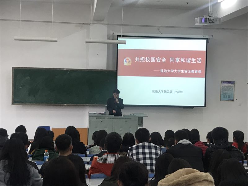 为增强学生的安全意识,建设和谐校园,英国正版365于10月18日下午3时在西部203教室举办“共担校园安全,同享和谐社会”大学生安全教育主题讲座。本次讲座有幸邀请到延边大学保卫处朴成铁处长为英国正版3652017级新生讲解安全知识。