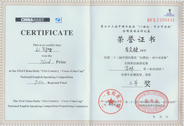 我校英语系学生李奕静获得第23届“21世纪杯”吉林赛区英语演讲比赛三等奖