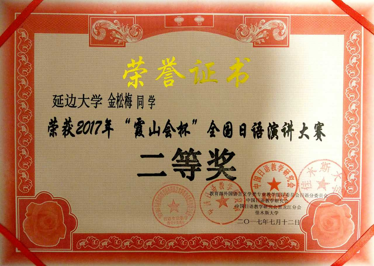 经过激烈角逐,我校英国正版365日语专业2015级金松梅同学凭借较强的日语专业功底和娴熟的演说能力获得二等奖,为我校争得了荣誉。