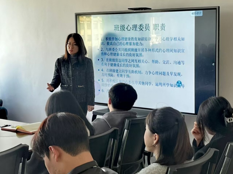 会上,郑老师结合大学生心理健康教育工作中的实际案例,以心理健康的内涵为切入点,详细介绍了高校心理委员岗位职责、心理委员需要具备的基本素质、如何识别需要帮助的同学等基本知识以及本学期心理委员的工作安排。
